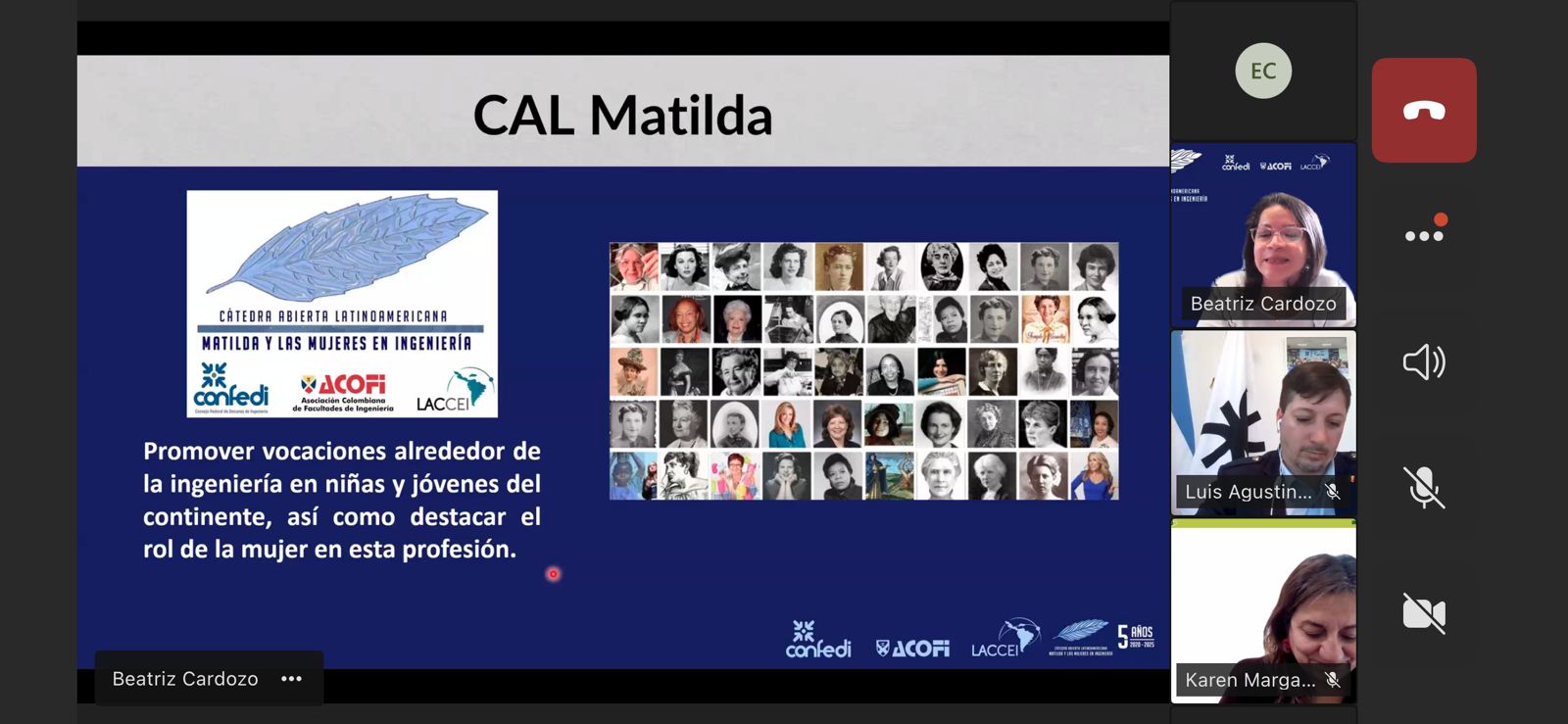Reunión con docentes integrantes de CAL-Matilda: Reunión profesoras de la Escuela de Ingeniería, Arquitectura y Diseño, y de la Dirección de Ciencias Básicas. En la reunión se compartieron experiencias sobre la educación e investigación con perspectiva de género en Argentina y Colombia. Con la coordinadora del comité de investigación Dra. Ing. Sonia Contreras Ortiz y la Dra. Vilma Ojeda se analizó las oportunidades de apoyo y fortalecimiento de las actividades y participantes de CAL Matilda.