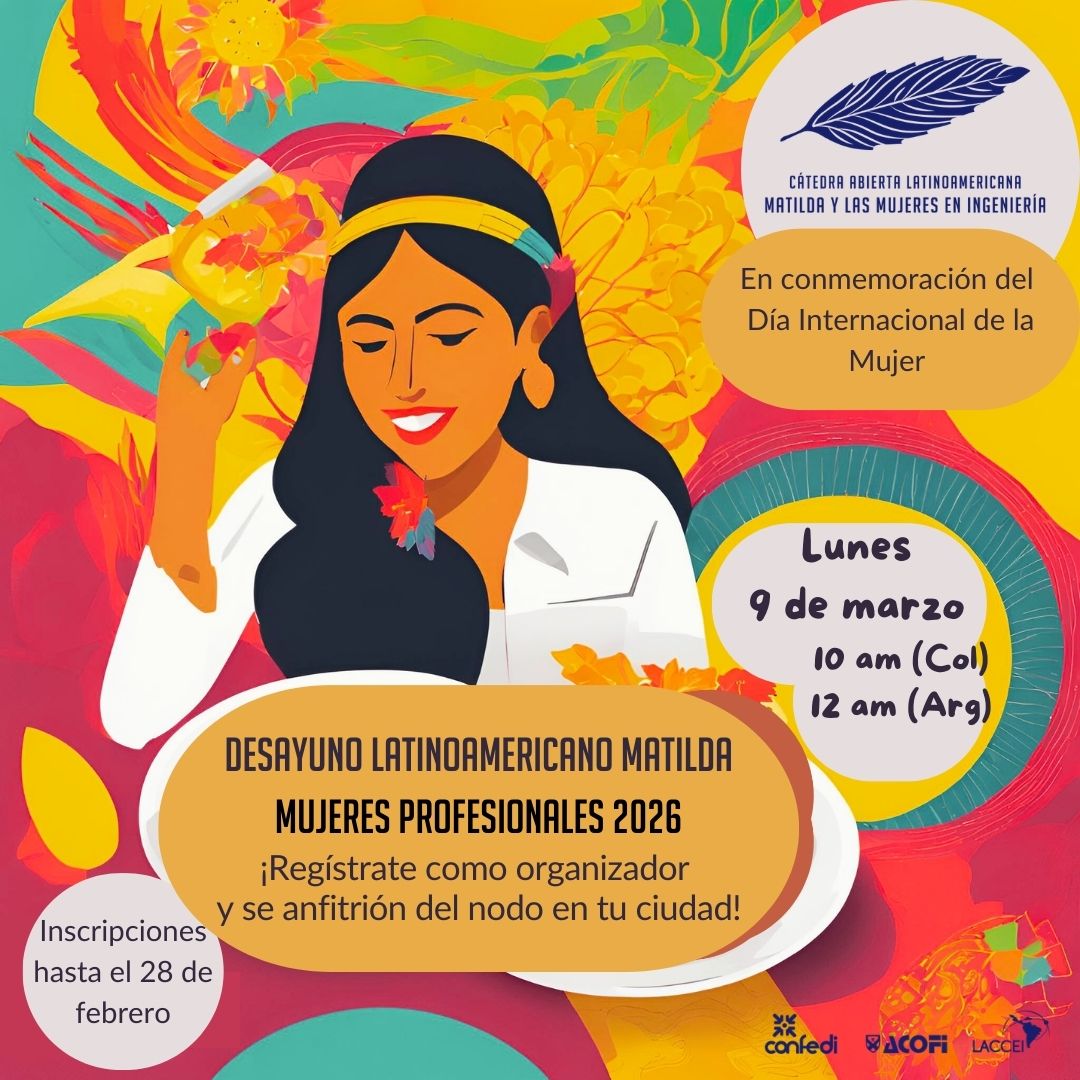 En el marco del Día Internacional de la Mujer, la Cátedra Abierta Latinoamericana Matilda y las Mujeres en Ingeniería, invita a las asociaciones, colegios y facultades de ingeniería a sumarse al Desayuno Latinoamericano Matilda – Mujeres Profesionales 2026, una iniciativa regional orientada a fortalecer la red de trabajo colaborativo en pro del cierre de brechas de género en ingeniería a desarrollarse el lunes 9 de marzo de 2026.
